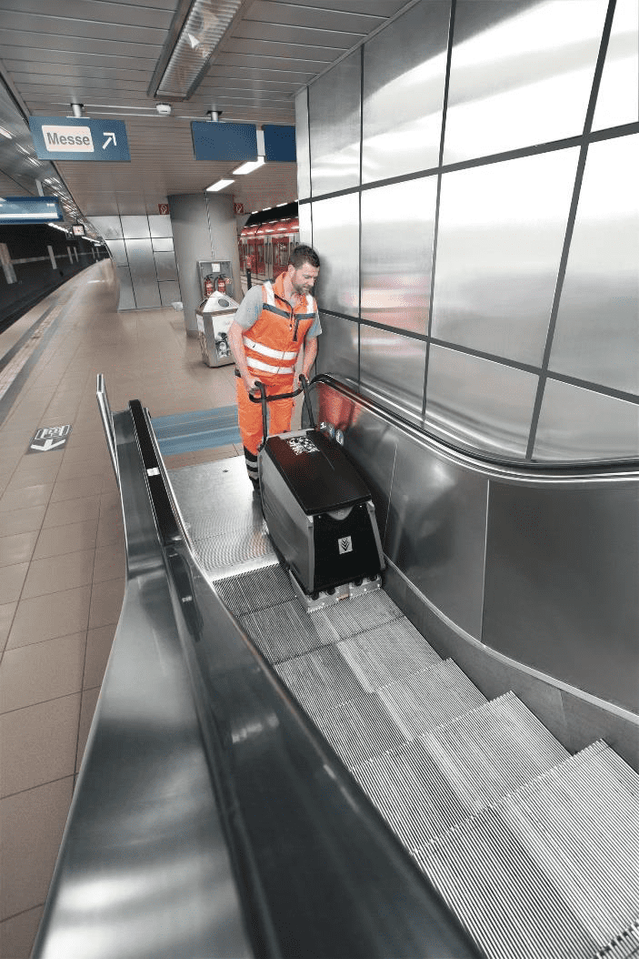 Die Reinigung mit der Maschine Kärcher BR 47/35 Esc Ep erfolgt bei laufender Rolltreppe beziehungsweise bei laufendem Fahrsteig.